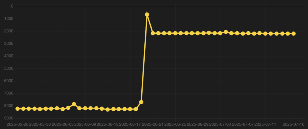 Desde su lanzamiento, Avia Masters ha mostrado un notable incremento en popularidad dentro de los casinos en línea. Como se observa en el gráfico, durante las primeras semanas tras su aparición, el número de jugadores diarios se mantuvo estable. Sin embargo, a partir del 17 de junio de 2025, la actividad se disparó drásticamente, registrando un crecimiento de más del 200% en tan solo dos días. Esta tendencia se ha estabilizado en un nuevo nivel mucho más alto, lo que demuestra el entusiasmo sostenido por el juego. Tanto las versiones con dinero real como Avia Masters demo han contribuido a esta expansión, atrayendo tanto a jugadores novatos como a apostadores experimentados.